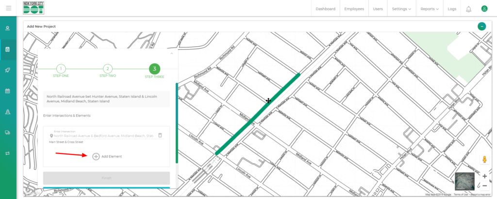 - Click the “Add element” button. An Element Pin will be placed on the map at the intersection that was previously defined. (See Figure 4)