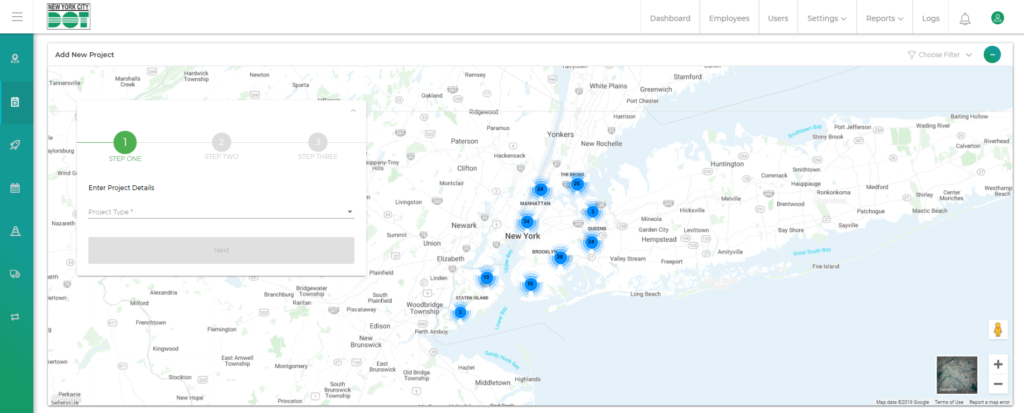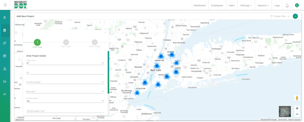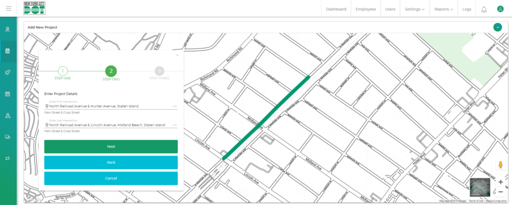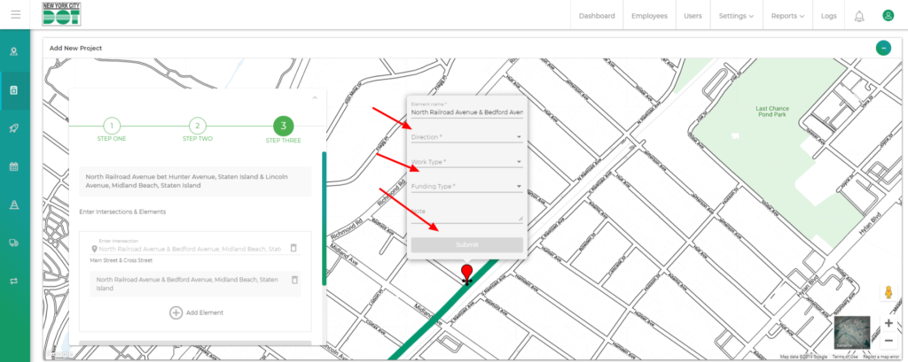 - Enter the first intersection where work will be performed. Provide the main street and cross the street. Once entered, an intersection marker will be placed on the map.