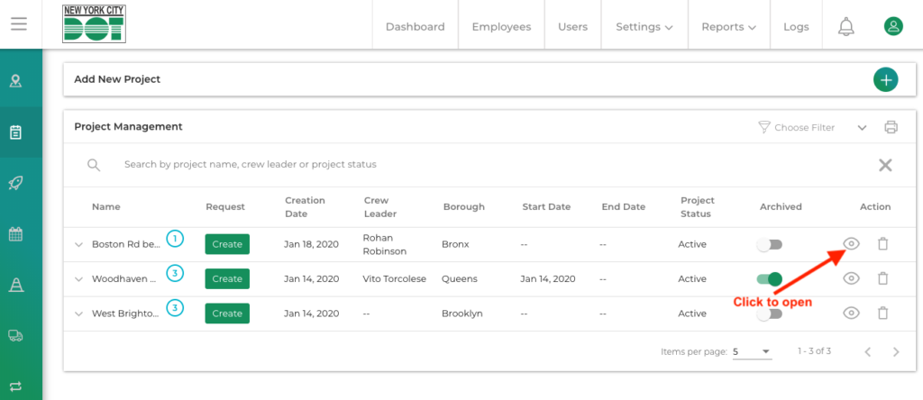 - Once your new Project has been added, go back into the Project screen and open the project by clicking the eye icon (See Figure 6).