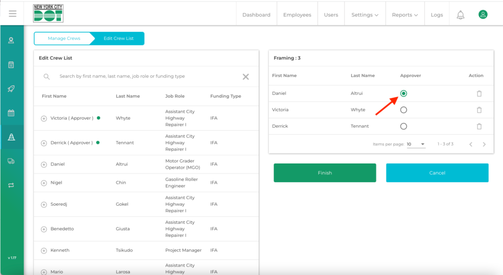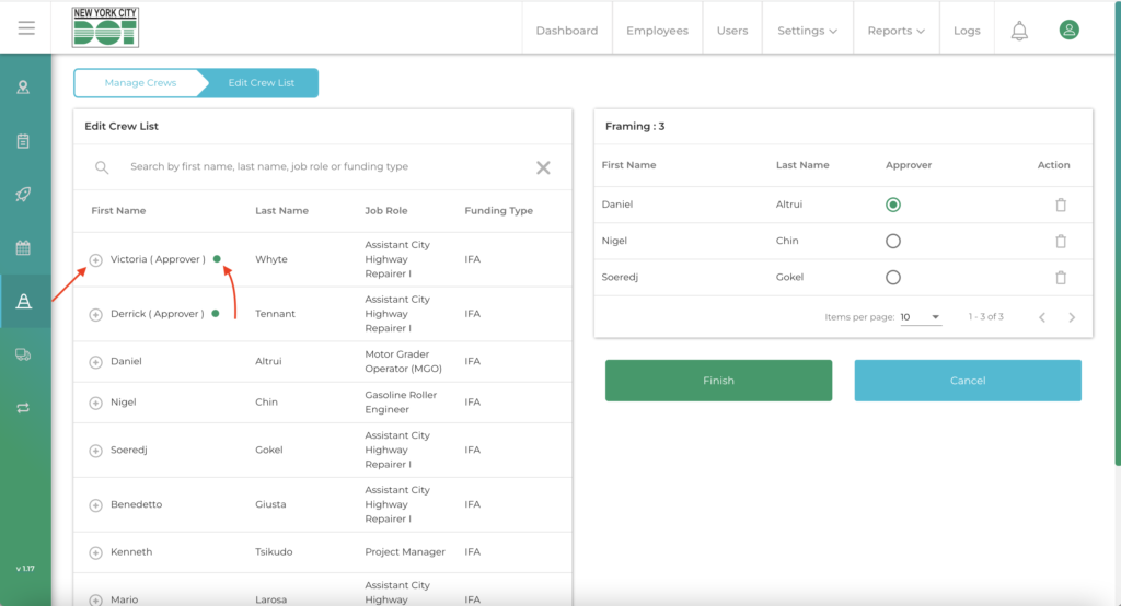 - Click on the small add icon on the left of the Employee’s First Name to assign him/her to the newly created crew. You will also notice a GREEN BUBBLE on the right side of the First Name for various employees (See Figure 4). The GREEN BUBBLE indicates that the employee is labeled a Senior Employee. This designation is set within the Employee Profile Screen. Each Crew must include at least 1 employee designated as the Senior Employee. In the event that a crew is created without a Senior Employee, the following error message will be displayed: “Crew Error 102: Incorrect Crew Configuration”.