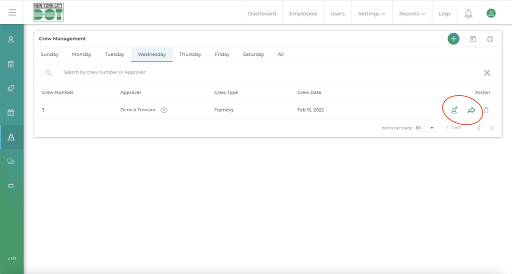 - On crew management screen, crews are displayed for the current week- Sunday through Saturday. By default, crews for the current day will be shown.
