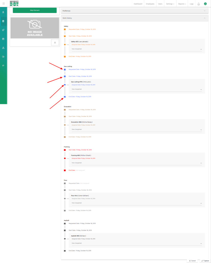 - This data will also include the requested date and time, crew assignment date and time for all particular stages and foreman, MGO or Mason names for each crew.